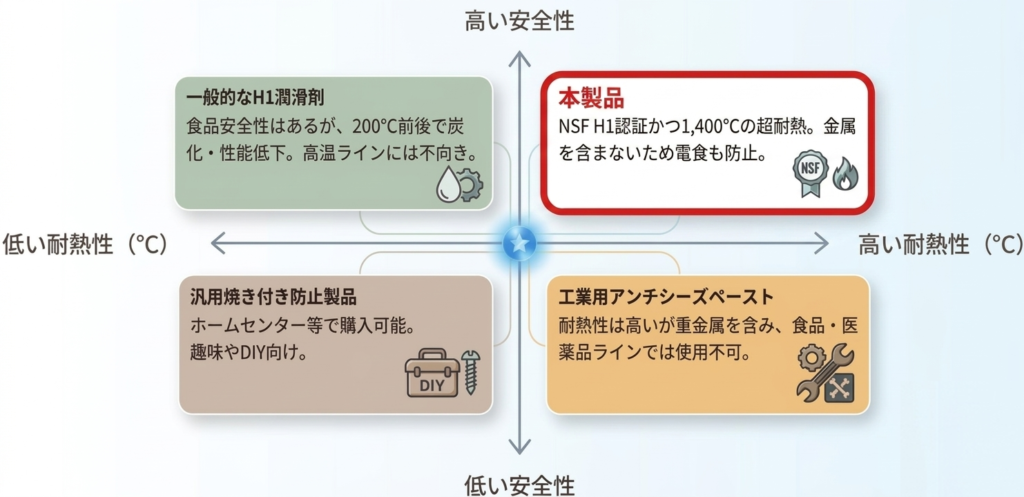 一般的に、NSF H1対応品は「安全性」に寄り、焼き付き防止は「耐熱」のために金属粉(銅・ニッケル等)を含みます。